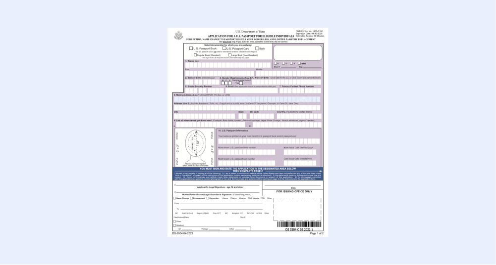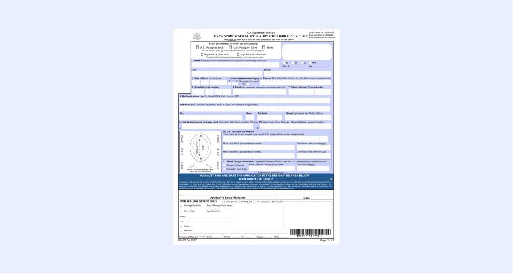 For first-time applicants, or if your previous passport was issued before you turned 16. We guide you through the official DS-11 form.